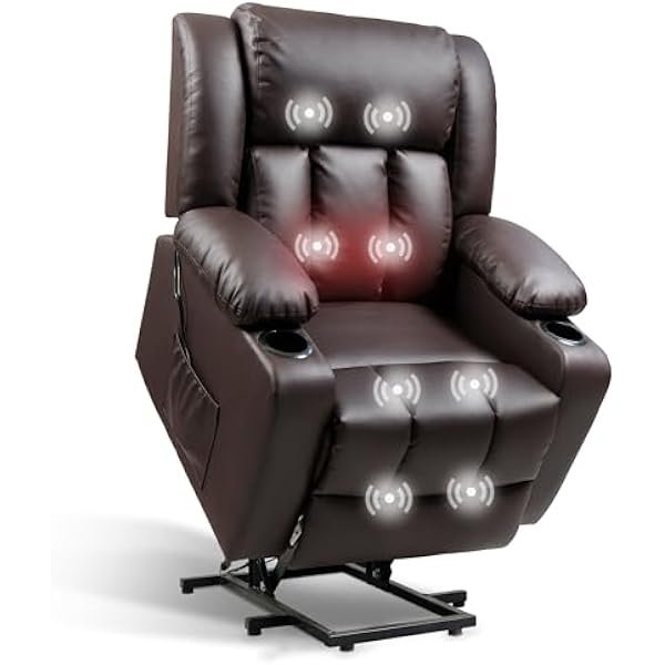 XL31 Power Lift Recliner Chair for Elderly, Electric Lift Chair with Massage & Heat, PU Leather Reclining Sofa w/Cup Holders, Side Pockets for Living Room Bedroom(Medium Size,Brown)